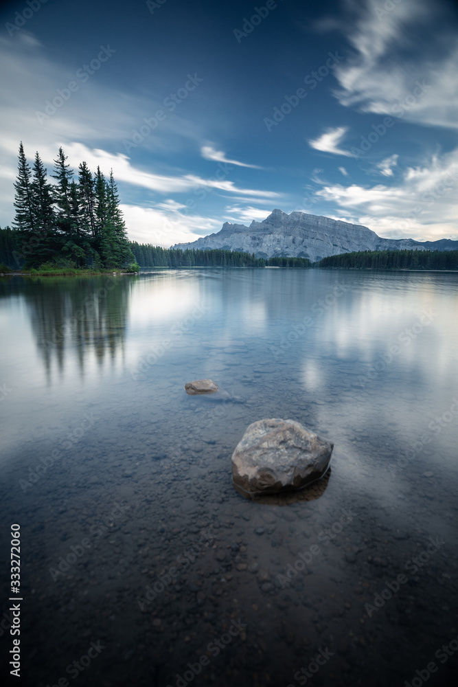 Two Jack Lake With A Pine Trees Island In The Morning With Beautiful Reflections And Blue Sky Banff National Park Canadian Rockies Alberta Canada North America Stock Photo Adobe Stock